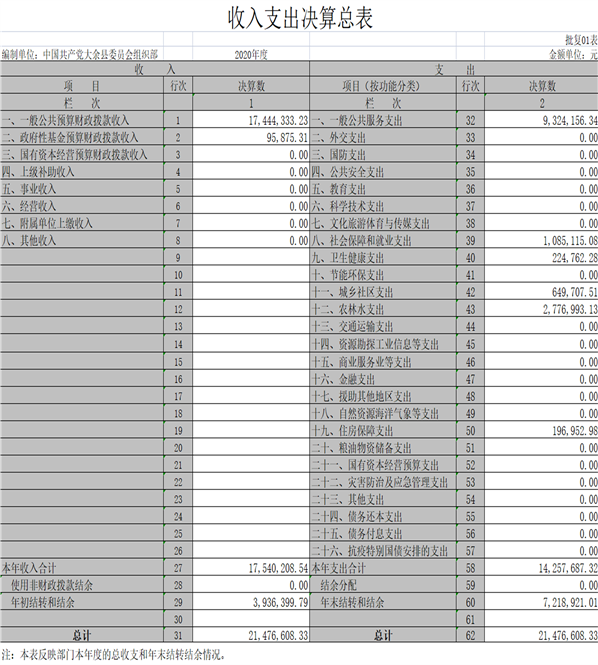 本單位2020年度收入總計2147.66萬元,其中年初結轉和結余393.64萬元,較2019年增加1384.45萬元,增長157.99%;本年收入合計1754.02萬元,較2019年增加1143.39萬元,增長187.24%,主要原因是:2020年4月縣委老干部局與機關工委合并在縣委組織部進行核算。
