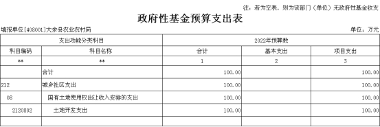 2022年大余縣農業農村局本級政府性基金支出預算為100萬元,較上年預算安排增加100萬元,主要原因是:增加了中心城區蔬菜基地建設項目;