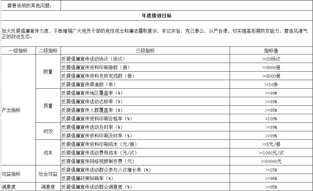 2021年實(shí)行績(jī)效目標(biāo)管理的項(xiàng)目1 個(gè):黨風(fēng)廉政建設(shè)宣傳經(jīng)費(fèi)。