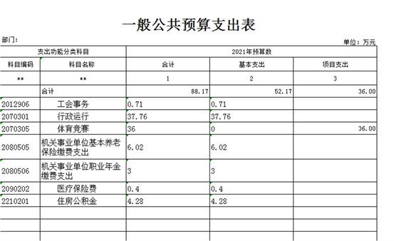 按支出項目類別劃分:基本支出64.62萬元,較上年預算安排增加0.99萬元;其中:工資福利支出51.06萬元,商品和服務支出13.56萬元。增加原因主要為人員工資晉升調整。項目支出10.56萬元,較上年預算安排一致;其中:工資福利支出10.56萬元,系體育中心保安保潔工資。