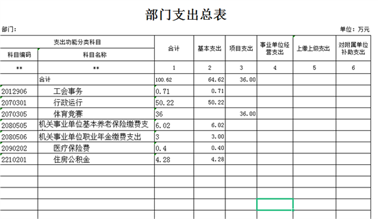 2021年大余縣體育局本級支出預算總額為100.62萬元,較上年預算增加金額0.99萬元,增加比例1%,主要增加原因為工資正常晉升。其中:64.62萬元,包括工資福利支出51.06萬元、商品和服務支出13.56 萬元;項目支出10.56萬元,包括工資福利支出0萬元、商品和服務支出0萬元、對個人和家庭的補助0萬元、對企事業單位的補貼0萬元、債務利息支出0萬元、債務還本支出0萬元、基本建設支出0萬元、其他資本性支出0萬元。