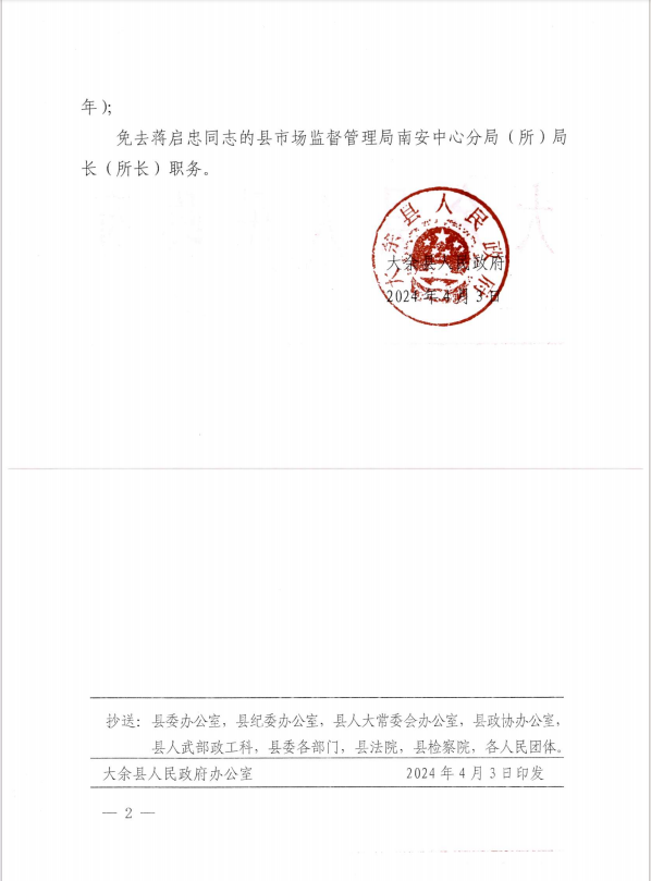 余府字〔2024〕20號大余縣人民政府關于張熙大等同志職務任免的通知