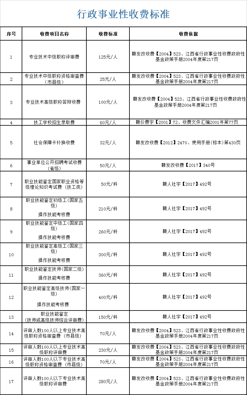 行政事業(yè)性收費標準