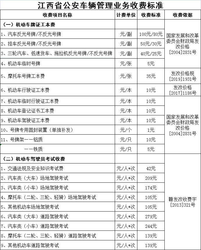 江西省公安車輛管理業務新收費標準