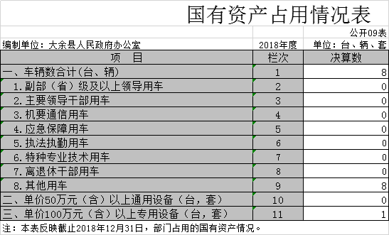 截止2018年12月31日,本部門共有車輛8輛,其中主要領導干部用車1輛、應急保障用車2輛,掛在我單位未進行固定資處理的5輛;單位價值100萬元以上專用設備 1套。