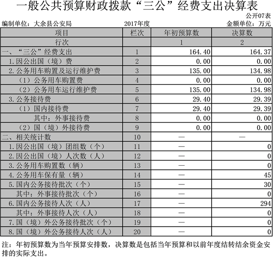(四)“三公經費”:納入財政預決算管理的“三公”經費,是指部門用財政撥款安排的因公出國(境)費、公務用車購置及運行費和公務接待費。其中,因公出國(境)費反映單位公務出國(境)的國際旅費、國外城市間交通費、住宿費、伙食費、培訓費、公雜費等支出;公務用車購置及運行費反映單位公務用車車輛購置支出(含車輛購置稅)及租用費、燃料費、維修費、過路過橋費、保險費、安全獎勵費用等支出;公務接待費反映單位按規定開支的各類公務接待(含外賓接待)支出。