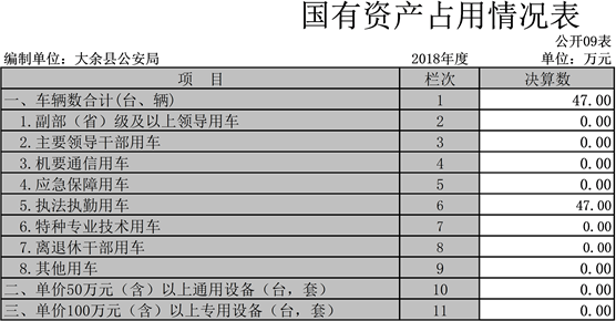 截止2018年12月31日,本部門共有車輛47輛,其中,副部(省)級及以上領導用車0輛、主要領導干部用車0輛、機要通信用車0輛、應急保障用車0輛、執法執勤用車47輛、特種專業技術用車0輛、其他用車0輛;單位價值50萬元以上通用設備0臺(套);單位價值100萬元以上專用設備0臺(套)。