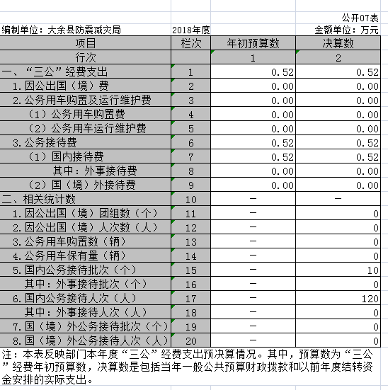 本部門2018年度一般公共預算財政撥款“三公”經費支出年初預算數為 0.52萬元,決算數為0.52萬元,完成預算的100%,決算數較上年減少44.7%,其中: