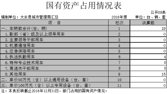 截止2018年12月31日,本部門共有車輛19輛,其中,執(zhí)法執(zhí)勤用車4輛、其他用車15輛,其他用車主要是環(huán)衛(wèi)所垃圾車6臺、大小壓縮車各1臺、灑水車1臺、吸糞車2臺;單位價值50萬元以上通用設(shè)備0臺;單位價值100萬元以上專用設(shè)備0臺。