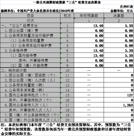 我委2018年度一般公共預算財政撥款“三公”經費支出年初預算數為13.40萬元,決算數為5.38萬元,完成預算的40%,決算數較2017年減少3.02萬元,下降36%,其中: