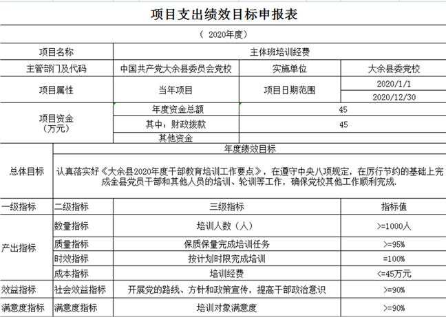 二、2020年主體班培訓(xùn)項(xiàng)目支出績效目標(biāo)申報(bào)表
