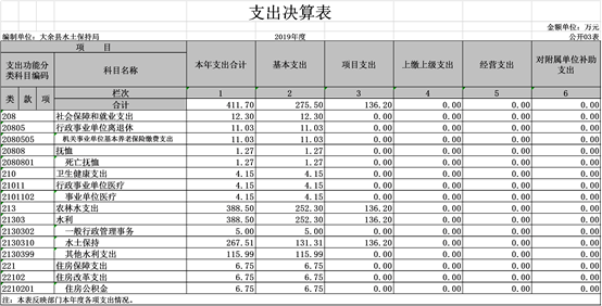 本部門2019年度支出總計705.81萬元,其中本年支出合計411.7萬元,較2018年增加159.23萬元,增長29.13 %,主要原因是:2019年增加了工程款項;年末結轉和結余294.1萬元,較2018年增加114.25萬元,增長63.52%,主要原因是:工程款支出較少。