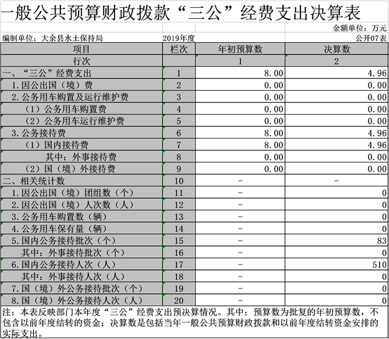 本部門2019年度一般公共預算財政撥款“三公”經費支出年初預算數為8萬元,決算數為4.96萬元,完成年初預算的62%,決算數較2018年減少4.44萬元,下降47%,其中: