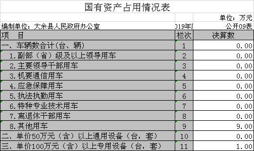 截截止2019年12月31日,本部門共有車輛9輛,其中主要領導干部用車1輛、應急保障用車2輛,掛在我單位未進行固定資處理的7輛;單位價值100萬元以上專用設備 1套。