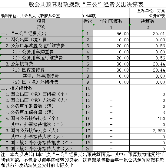 本部門2019年度一般公共預算財政撥款“三公”經費支出年初預算數為 56萬元,決算數為39.01萬元,完成年初預算的 70%,決算數較2018年減少9.12萬元,下降19 %,其中: