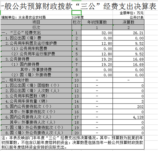 (十三)“三公”經(jīng)費:指本部門使用一般公共預(yù)算財政撥款安排的因公出國(境)費、公務(wù)用車購置及運行費和公務(wù)接待費。其中因公出國(境)費反映單位因公出國(境)的住宿費、旅費、伙食費、培訓(xùn)費、雜費等支出;公務(wù)用車購置及運行費反映單位公務(wù)用車車輛購置支出(含車輛購置稅)及租用費、燃料費、維修費、過路過橋費、保險費、安全獎勵費用等支出;公務(wù)接待費反映單位按規(guī)定開支的各類公務(wù)接待(含外事接待)支出。我部門的統(tǒng)計口徑包含大余縣農(nóng)業(yè)和糧食局及二級事業(yè)單位大余縣能源建設(shè)領(lǐng)導(dǎo)小組辦公室、大余縣花卉發(fā)展辦公室。