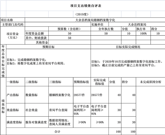 我部門今年在縣級部門決算中反映紙質檔案數字化項目績效自評結果。