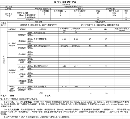 “走訪慰問經費”項目績效自評綜述:根據年初設定的績效目標,項目績效自評得分為 100 分。項目全年預算數為3萬元,執行數為3萬元,完成預算的 100 %。績效指標完成成績:完成走訪慰問次數52次,走訪對像覆蓋率≥98%、走訪工作完成及時率100%,實地調研走訪資料10次,走訪對象滿意度100%。