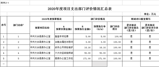 組織對“中共大余縣辦公室工作經費”、“中共大余縣辦公室督查工作經費”、“走訪慰問經費”、“政務公開網絡維護費”、“六大攻堅戰指揮部辦公室工作經費”等5個項目開展了部門評價,涉及一般公共預算支出245.16萬元,政府性基金預算支出0萬元。從評價情況來看,活動都正常開學,群眾滿意度達到100%,業務完成及時率達到100%。
