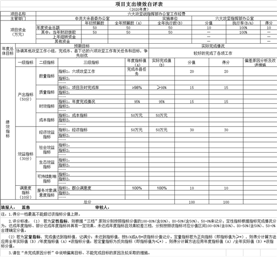 “六大攻堅戰指揮部辦公室工作經費”項目績效自評綜述:根據年初設定的績效目標,項目績效自評得分為 100 分。項目全年預算數為50萬元,執行數為50萬元,完成預算的 100 %。績效指標完成成績:六項攻堅工作完成市縣任務,項目及時完成率98%、年度完成情況95%,成本指標50萬元,經濟指標50萬元,群眾滿意度100%。