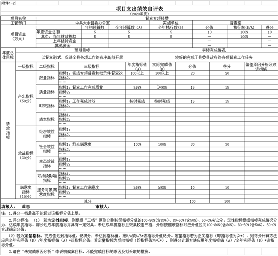 “督查專項經費”項目績效自評綜述:根據年初設定的績效目標,項目績效自評得分為 100 分。項目全年預算數為5萬元,執行數為5萬元,完成預算的 100 %。績效指標完成成績:完成專項督查和批示件數100個上,工作完成質量≥98%、,群眾滿意度100%,督查工作滿意度≥98%。