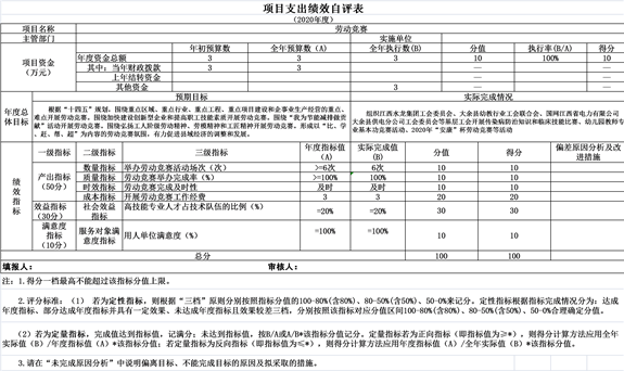 項目績效自評總體綜述:根據年初設定的績效目標,部門工作經費項目績效自評得分為94分。項目全年預算數為3萬元,執行數為3萬元,完成預算的100%。項目績效目標完成情況:一是履職完成情況。按照年初單位總體工作目標,較好地完成了年初制定的各項工作任務。二是履職效果情況。通過一年來的工作,取得了較好的績效成果,整體支出績效評價自評分為94分。發現的問題及原因:一是主要問題及原因分析。勞動競賽的參與性和專業性有待進一步提高。主要是在行業宣傳和專業培訓方面需進一步加強。二是改進的方向和具體措施。在行業監管方面加強工作力度,采取宣傳欄、廣告、多媒體等多種形式加強宣傳,使我縣職工技能素質、創新能力顯著提升,技術工人隊伍不斷壯大。