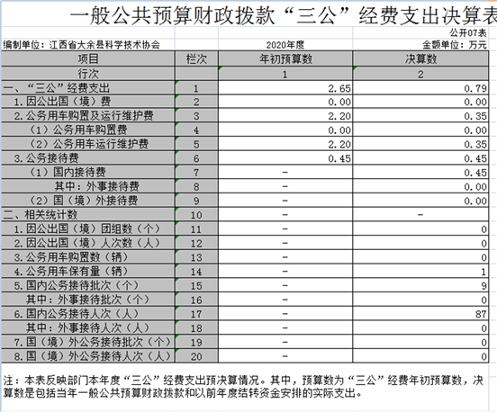 (六)“三公”經(jīng)費(fèi)支出:納入財(cái)政預(yù)決算管理的“三公”經(jīng)費(fèi),是指部門用財(cái)政撥款安排的因公出國(guó)(境)費(fèi)、公務(wù)用車購(gòu)置及運(yùn)行費(fèi)和公務(wù)接待費(fèi)。其中,因公出國(guó)(境)費(fèi)反映單位公務(wù)出國(guó)(境)的國(guó)際旅費(fèi)、國(guó)外城市間交通費(fèi)、住宿費(fèi)、伙食費(fèi)、培訓(xùn)費(fèi)、公雜費(fèi)等支出;公務(wù)用車購(gòu)置及運(yùn)行費(fèi)反映單位公務(wù)用車車輛購(gòu)置支出(含車輛購(gòu)置稅)及租用費(fèi)、燃料費(fèi)、維修費(fèi)、過(guò)路過(guò)橋費(fèi)、保險(xiǎn)費(fèi)、安全獎(jiǎng)勵(lì)費(fèi)用等支出;公務(wù)接待費(fèi)反映單位按規(guī)定開(kāi)支的各類公務(wù)接待(含外賓接待)支出。