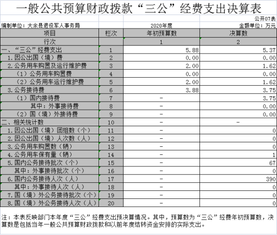 (八)“三公”經費:納入財政預決算管理的“三公”經費,是指部門用財政撥款安排的因公出國(境)費、公務用車購置及運行費和公務接待費。其中,因公出國(境)費反映單位公務出國(境)的國際旅費、國外城市間交通費、住宿費、伙食費、培訓費、公雜費等支出;公務用車購置及運行費反映單位公務用車車輛購置支出(含車輛購置稅)及租用費、燃料費、維修費、過路過橋費、保險費、安全獎勵費用等支出;公務接待費反映單位按規定開支的各類公務接待(含外賓接待)支出。