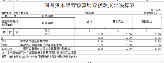 (九)國有資本經(jīng)營預(yù)算支出初預(yù)算數(shù)為0萬元,決算數(shù)為8.96萬元,完成年初預(yù)算的 100 %,主要原因是:林業(yè)工業(yè)公司留守人員經(jīng)費(fèi)。