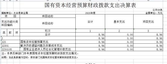 (九)國有資本經營預算支出初預算數為0萬元,決算數為8.96萬元,完成年初預算的 100 %,主要原因是:林業(yè)工業(yè)公司留守人員經費。