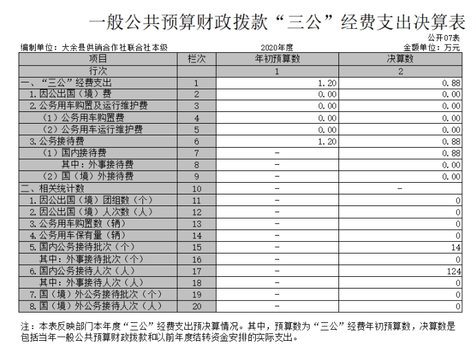 (二)公務(wù)接待費(fèi)支出年初預(yù)算數(shù)為1.2萬(wàn)元,決算數(shù)為0.88萬(wàn)元,完成預(yù)算的73.33 %,決算數(shù)較2019年減少0.67萬(wàn)元,減少43.22%,主要原因:是厲行節(jié)約和有應(yīng)付未付的費(fèi)用。決算數(shù)較年初預(yù)算數(shù)減少的主要原因是:有應(yīng)付未付的費(fèi)用。全年國(guó)內(nèi)公務(wù)接待14批,累計(jì)接待124人次,其中外事接待0批,累計(jì)接待0人次,主要為:全年無(wú)此項(xiàng)業(yè)務(wù)。