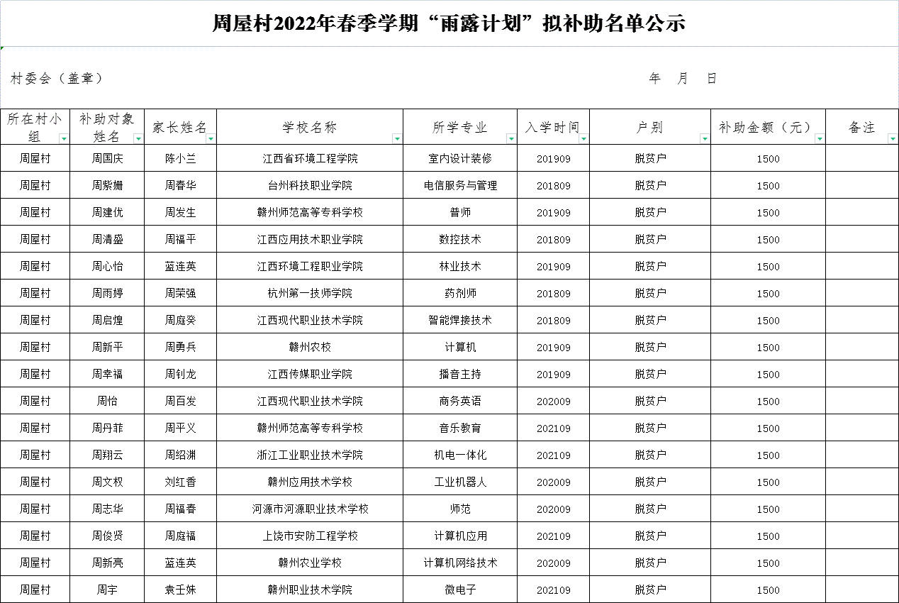 周屋村2022年春季學期“雨露計劃”擬補助名單公示