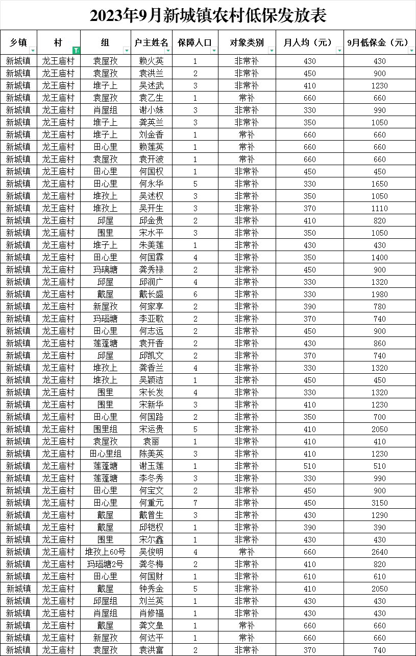 新城鎮(zhèn)龍王廟村2023年9月農(nóng)村低保發(fā)放公示