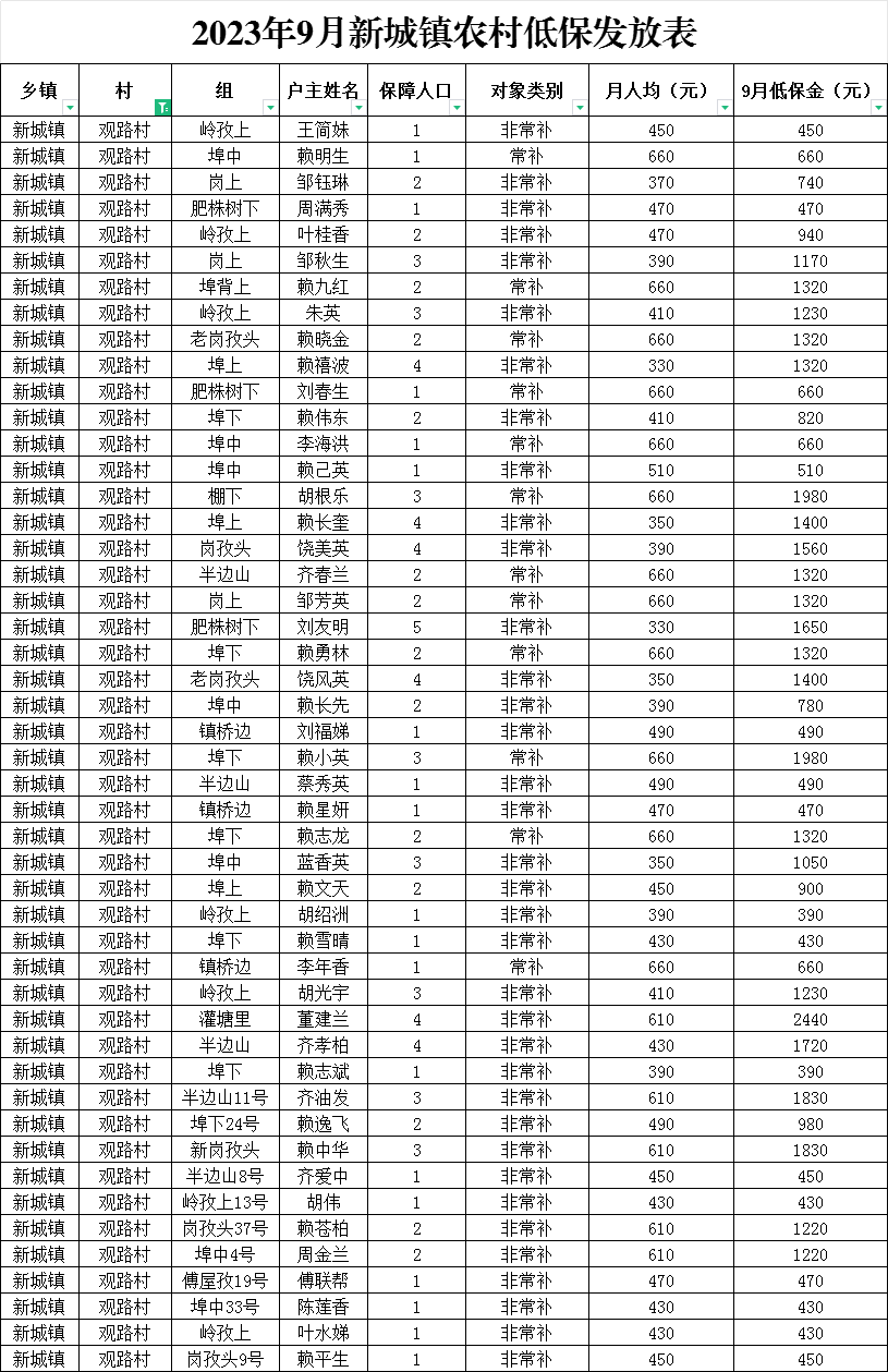 新城鎮(zhèn)觀路村2023年9月農(nóng)村低保發(fā)放公示