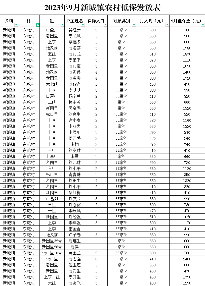 新城鎮(zhèn)東乾村2023年9月農村低保發(fā)放公示