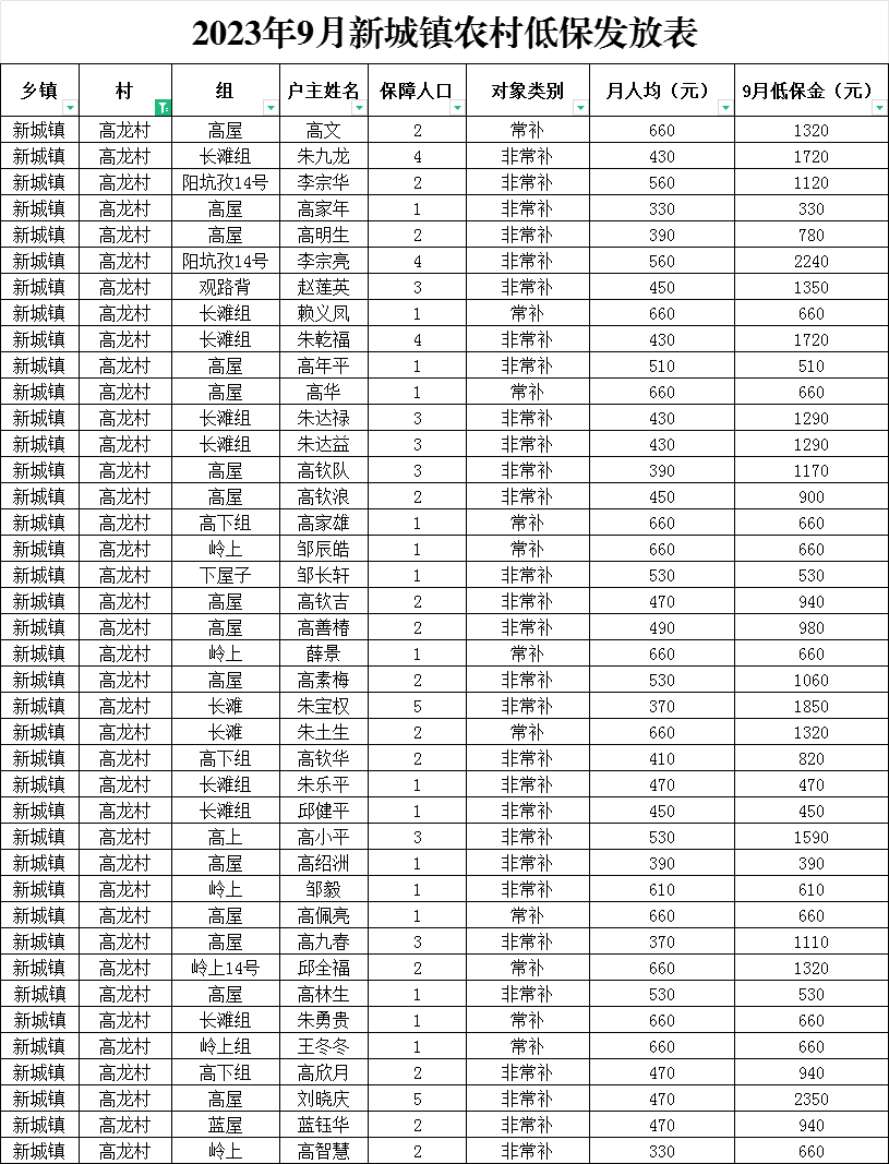 新城鎮高龍村2023年9月農村低保發放公示