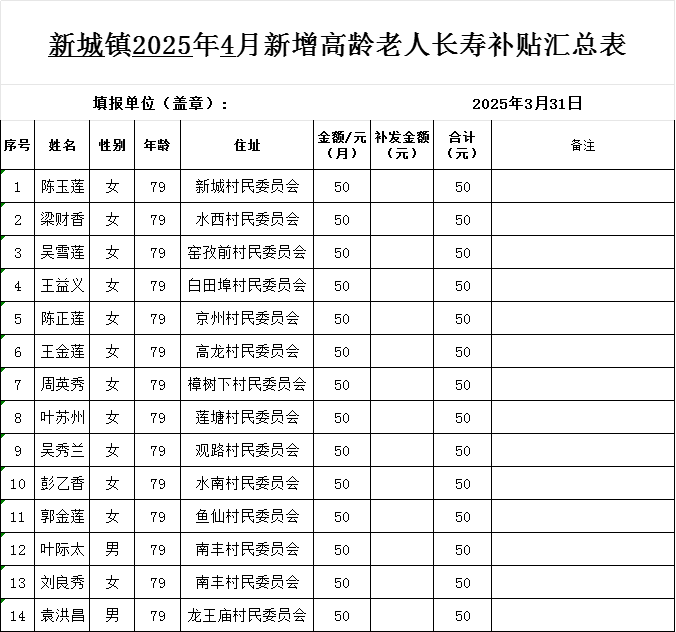 新城鎮2025年4月新增高齡老人長壽補貼匯總表