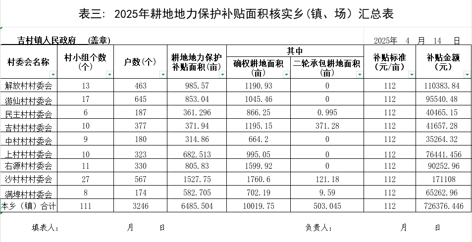吉村村2025年耕地地力保護補貼面積核實農戶登記表