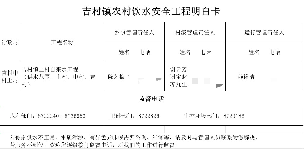 吉村鎮(zhèn)農(nóng)村飲水安全工程明白卡