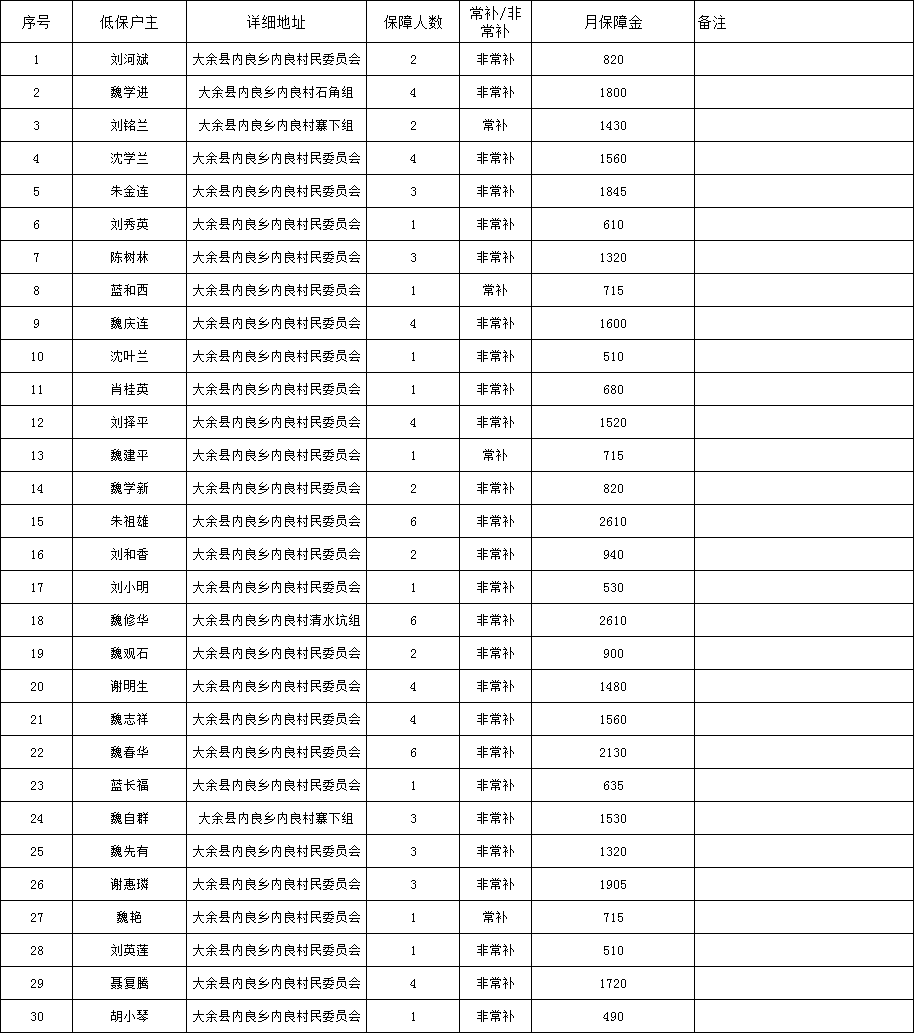內良鄉內良村2025年1月農村最低生活保障資金發放表