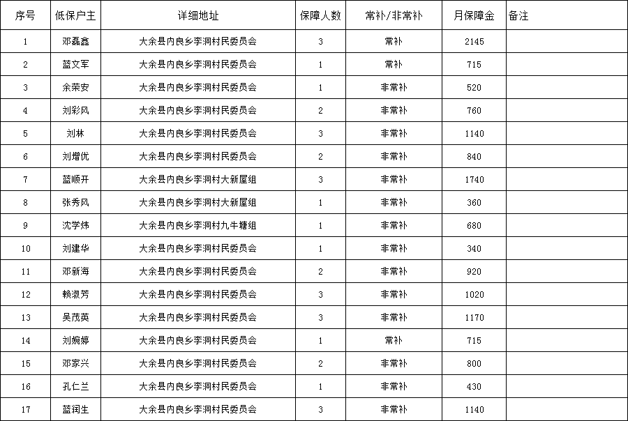 內良鄉李洞畬族村2025年1月農村最低生活保障資金發放表