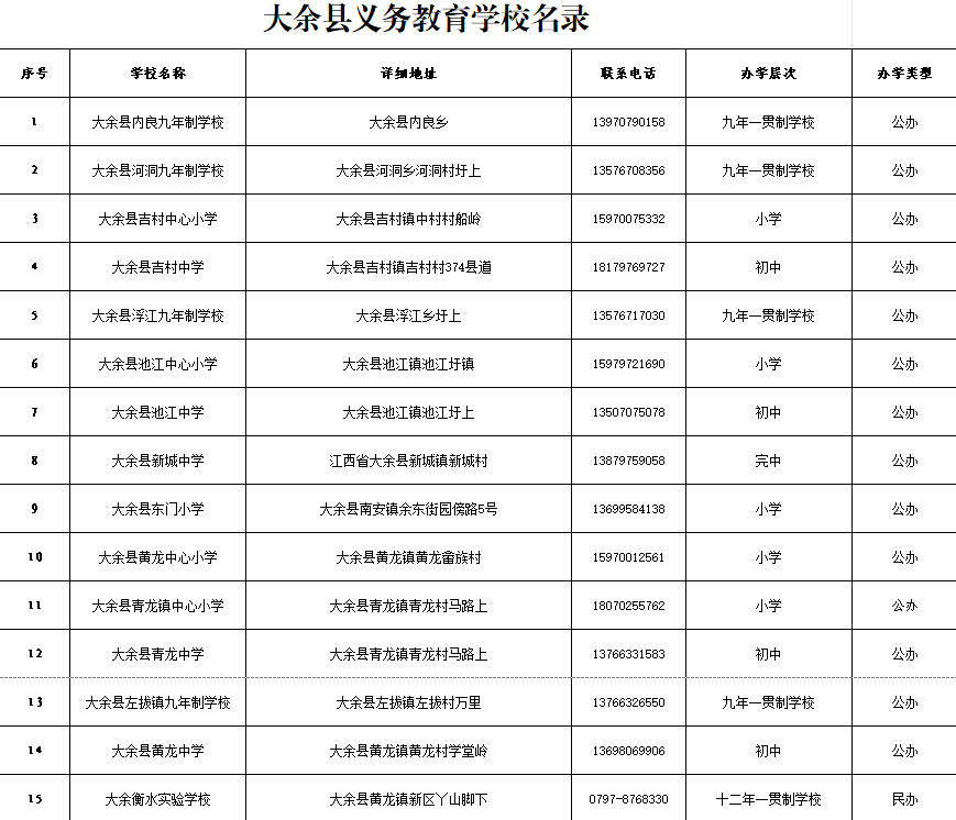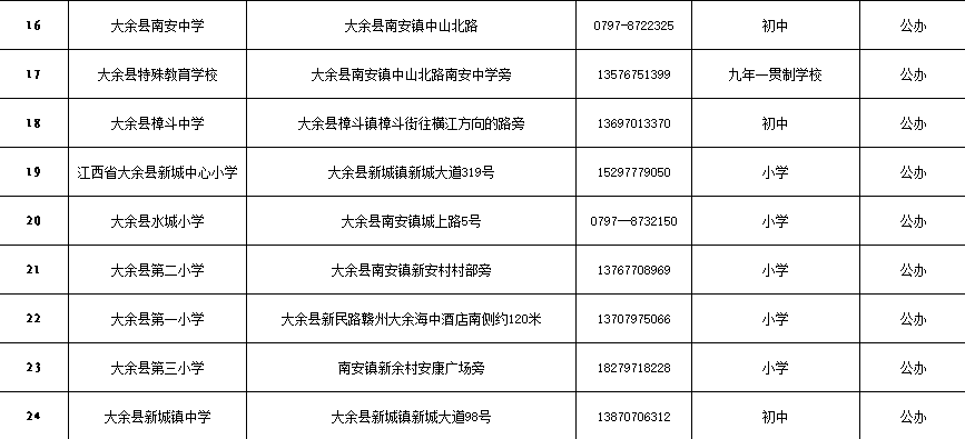大余縣義務教育學校名錄