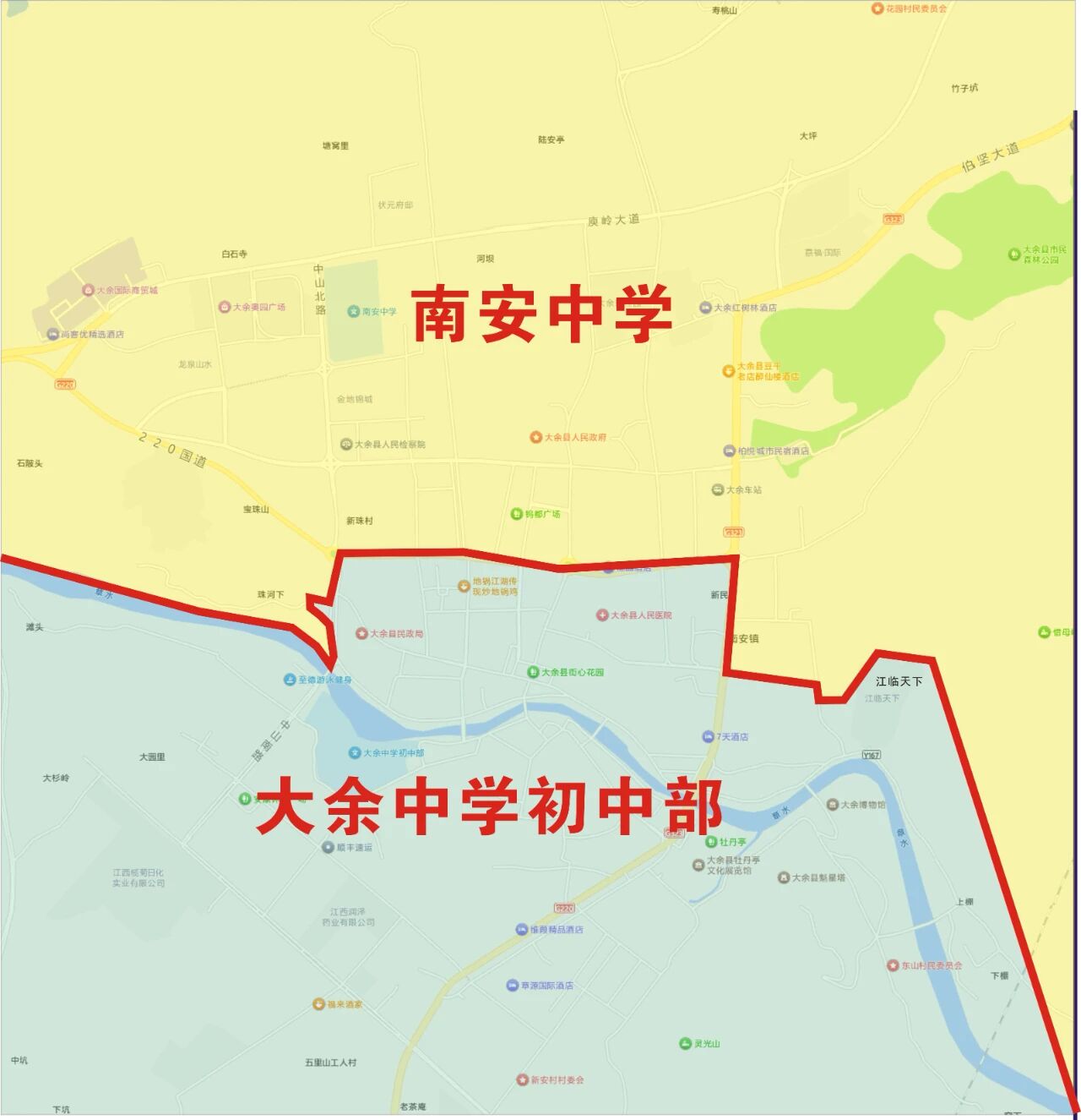 3.城區初中七年級新生按學區進行劃片招生,具體學區劃分如下:以南安大道為界,東至伯堅大道以西,西至中山北路以東,以南為大余中學初中部學區,以北為南安中學學區;考慮就近入學原則,將君臨天下小區、人民路東以東(含江臨天下小區、東山村、新建村)列入大余中學初中部學區。