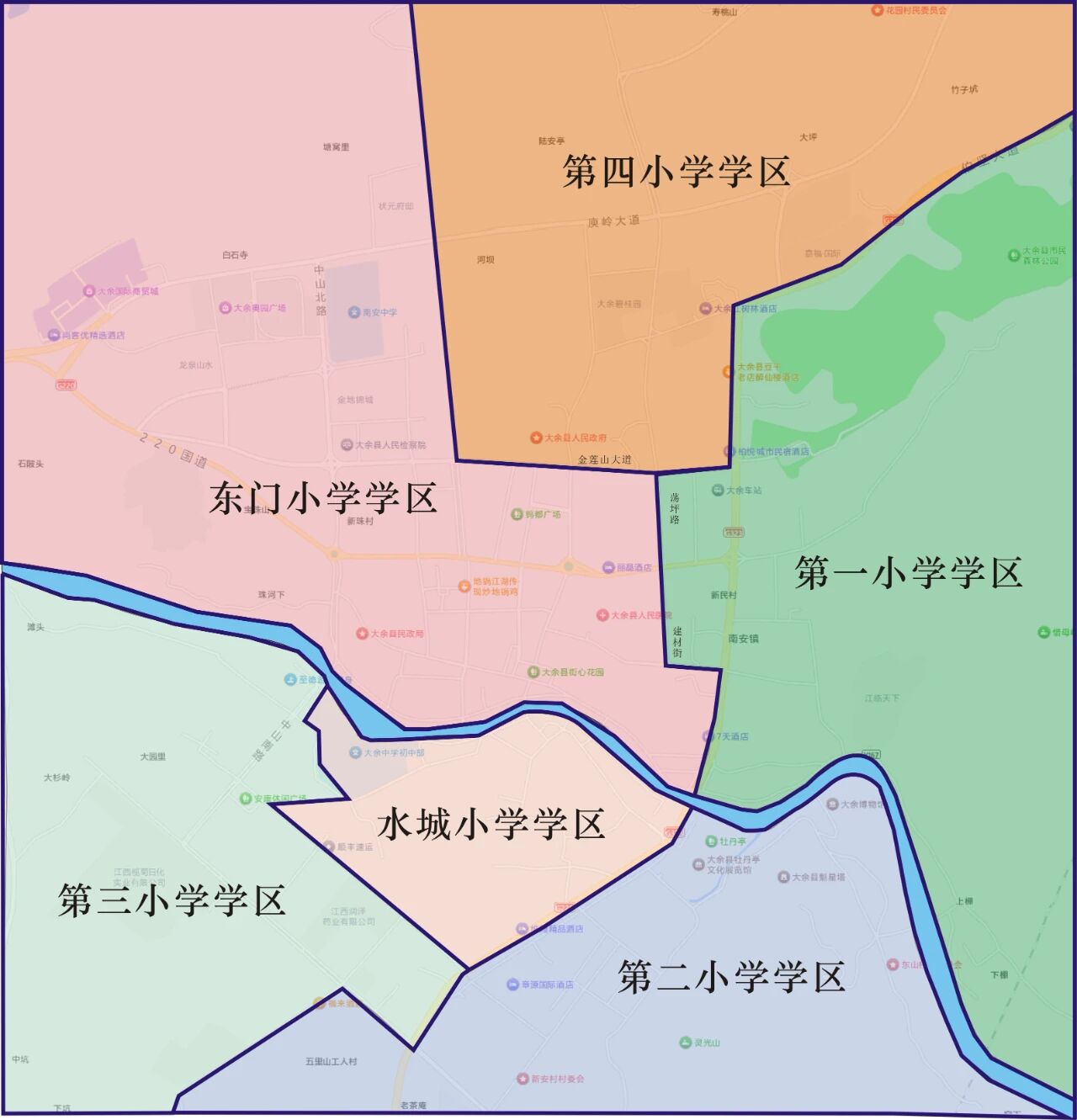 (3)大余縣第四小學學區范圍:北門河路(北起庾嶺大道路口,南至金蓮山大道路口)以東、金蓮山大道(東起大余汽車站,西至檢察院路口)以北、323國道(北起中醫院路口,南至汽車站路口)以西(含盛世嘉園小區、財富公館、嘉福國際、南安首府、嘉福國際豪庭、花園村、龍安新區)。