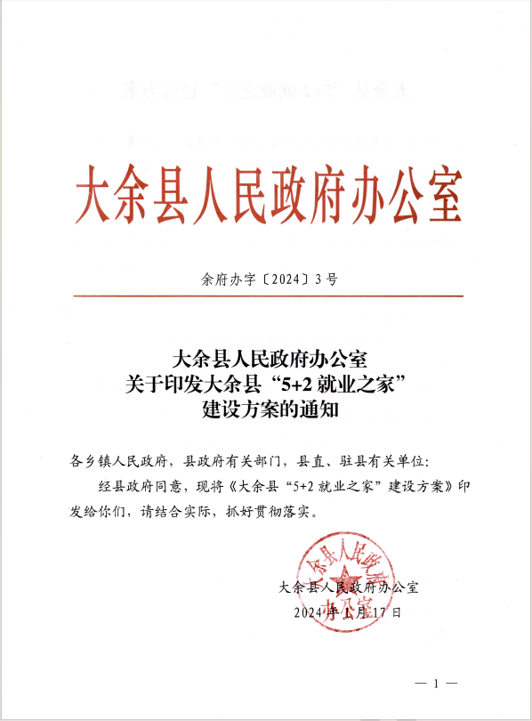 余府辦字〔2024〕3字大余縣人民政府辦公室關于印發大余縣“5+2就業之家“建設方案的通知