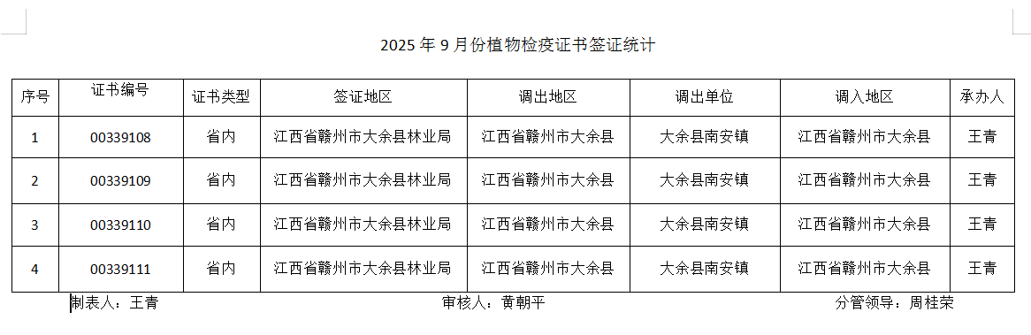 2025年9月份植物檢疫證書簽證統(tǒng)計(jì)