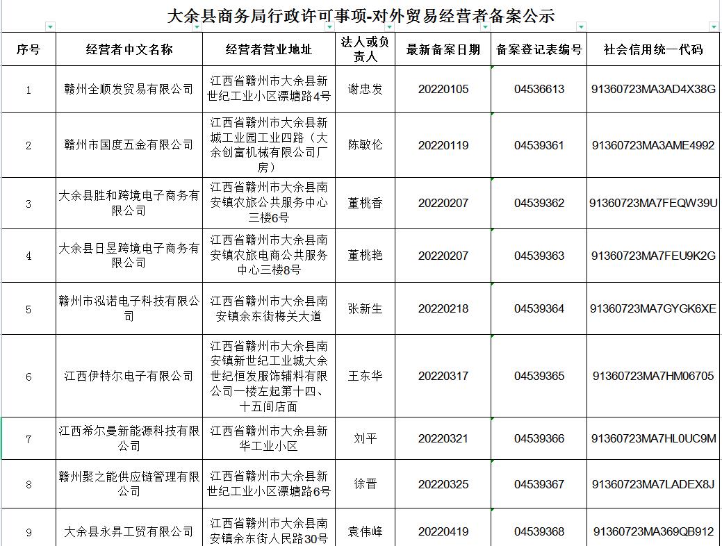 大余縣商務(wù)局行政許可事項(xiàng)-對(duì)外貿(mào)易經(jīng)營(yíng)者備案公示