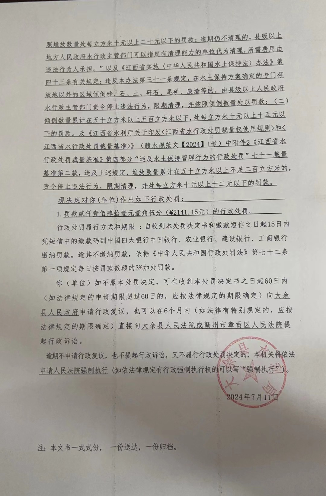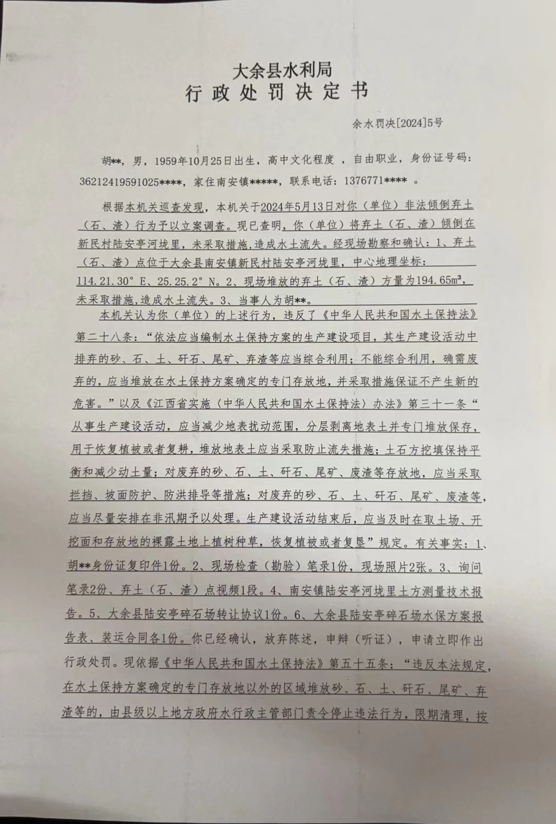 大余縣水利局行政處罰決定書 余水罰決【2024】5號