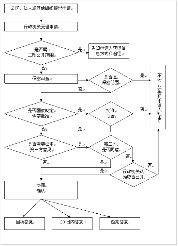 行政機關收到政府信息公開申請,能夠當場答復的,應當當場予以答復。行政機關不能當場答復的,應當自收到申請之日起20個工作日內予以答復;需要延長答復期限的,應當經政府信息公開工作機構負責人同意并告知申請人,延長的期限最長不得超過20個工作日。行政機關征求第三方和其他機關意見所需時間不計算在前款規定的期限內。