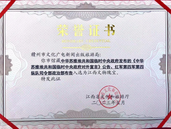 2023年5月18日,恰逢第47個(gè)國際博物館之際,江西省文化和旅游廳發(fā)布了全省文物瑰寶暨十大鎮(zhèn)館之寶評選結(jié)果。我館送審的《紅軍第四軍第四縱隊(duì)司令部政治部布告》成功入選!